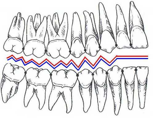 die Artikulationsfläche aus der Seite des Zahnes. Diese